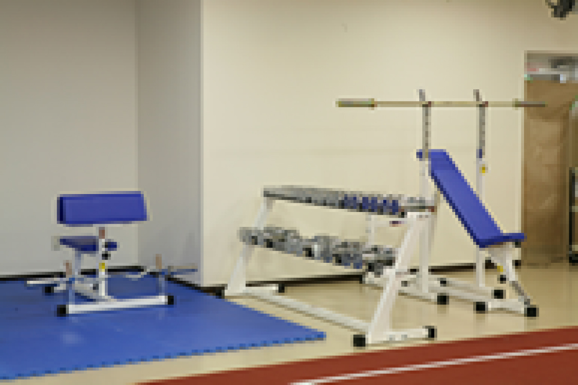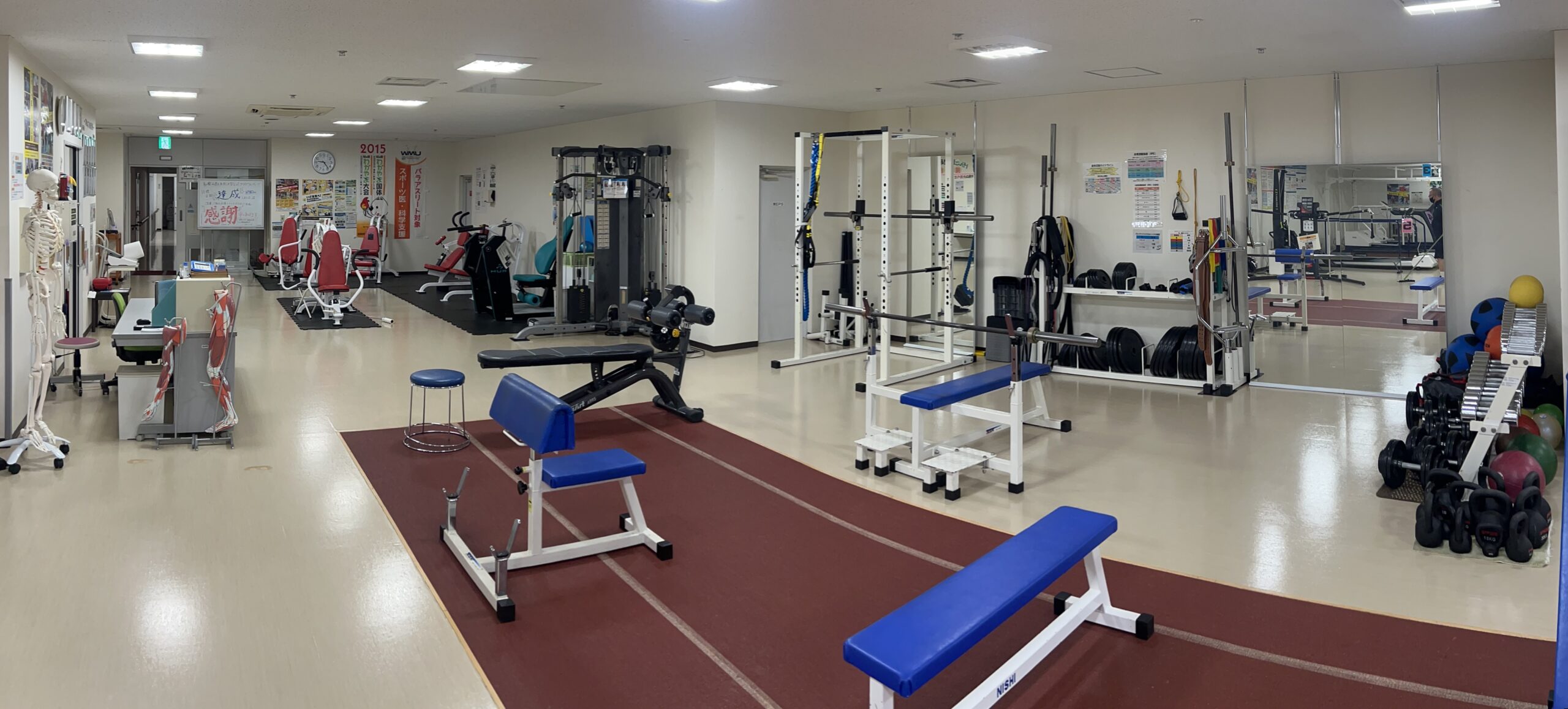 一般的なレジスタンストレーニングを行えるよう、各種フリーウェイト機器を取り揃えております。また油圧式、空気圧式などのトレーニングマシンが複数台設置されており、リハビリ後などの軽い筋力トレーニングを安全に行うことも可能です。